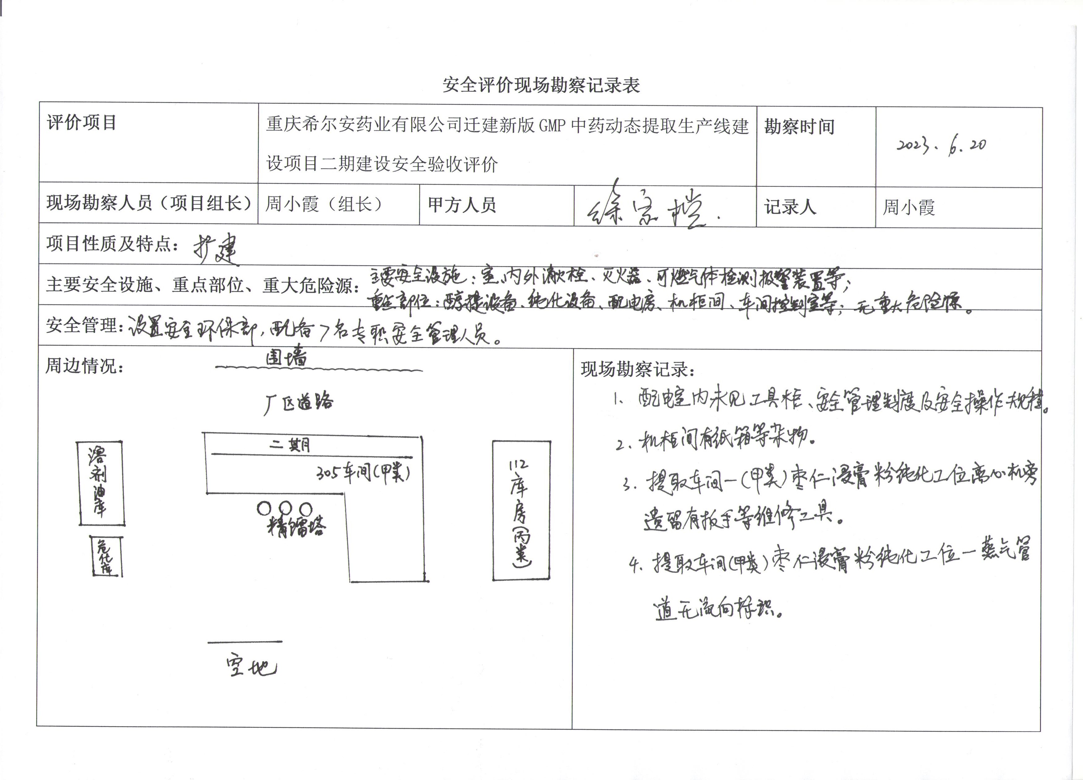 項目名稱 | 重慶希爾安藥業有限公司遷建新版 GMP 中藥動態提取生產線建設項目二期建設安全驗收評價 | 合同編號 | DA(渝)-PJ-20221009 | |||||